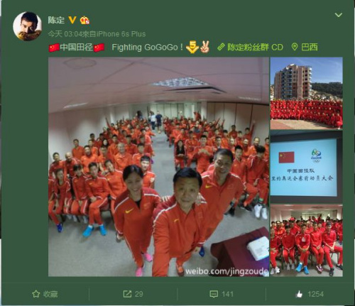 北京時(shí)間凌晨,中國(guó)田徑隊(duì)在里約召開(kāi)賽前動(dòng)員大會(huì),田徑運(yùn)動(dòng)員陳定曬出了田徑大家庭的全家福,并表示“中國(guó)田徑, Fighting GoGoGo!”