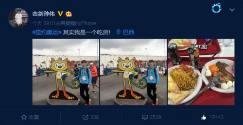本屆奧運(yùn)會(huì)顏值頗高的中國(guó)男子擊劍隊(duì),憑借帥氣外表、出眾身材成為新晉網(wǎng)紅,男子佩劍運(yùn)動(dòng)員孫偉的粉絲更是暴增。北京時(shí)間8日早上9點(diǎn),孫偉曬出自己在奧運(yùn)村餐廳的食物,并調(diào)侃“其實(shí)我是一個(gè)吃貨!”