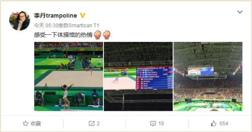 蹦床隊(duì)隊(duì)員李丹還在備戰(zhàn)中,她也在微博上曬出了訓(xùn)練的照片。為了盡早的適應(yīng)場(chǎng)地,李丹還專程到比賽場(chǎng)地“感受一下體操館熱情”。