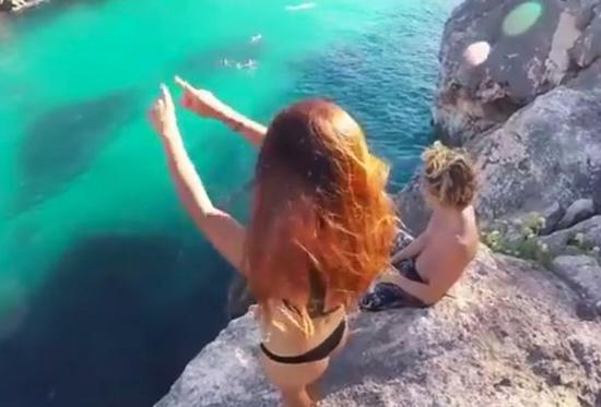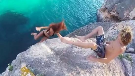 視頻中,這對身份不明的情侶坐在懸崖上俯瞰美麗的泄湖水域。穿著比基尼的年輕女子準(zhǔn)備跳入水中卻不慎絆倒,驚慌失措地抓住了巖壁。接著,她伸手欲抓住男友的腿爬上懸崖——然而男子卻把腿移開,從容地目睹著女友滑落崖壁,跌入水中。