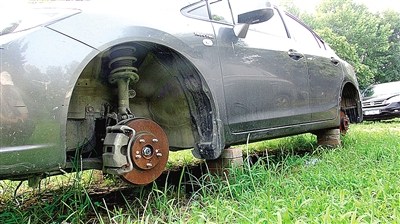 昨日上午,記者來(lái)到本田車(chē)停放現(xiàn)場(chǎng)。該車(chē)四周停放有上百輛轎車(chē),唯獨(dú)本田轎車(chē)4個(gè)輪胎連輪轂全部被卸走,只留下已經(jīng)是銹跡斑斑的剎車(chē)轂。車(chē)輪旁邊平整地支起5塊紅磚。車(chē)底雜草叢生,車(chē)身四周滿(mǎn)是塵土,由此推斷,車(chē)輪被卸已經(jīng)有很長(zhǎng)時(shí)間了。
