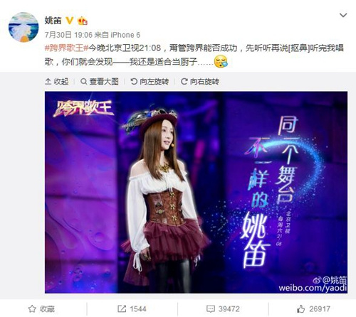 資料圖:近日姚笛錄制《跨界歌王》。(姚笛微博截圖)