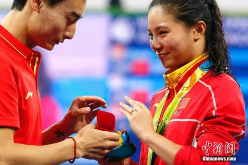 當(dāng)?shù)貢r間8月14日,2016里約奧運女子三米板決賽賽后,中國跳水運動員秦凱向剛剛獲得銀牌的何姿求婚。中新網(wǎng)記者 富田 攝
