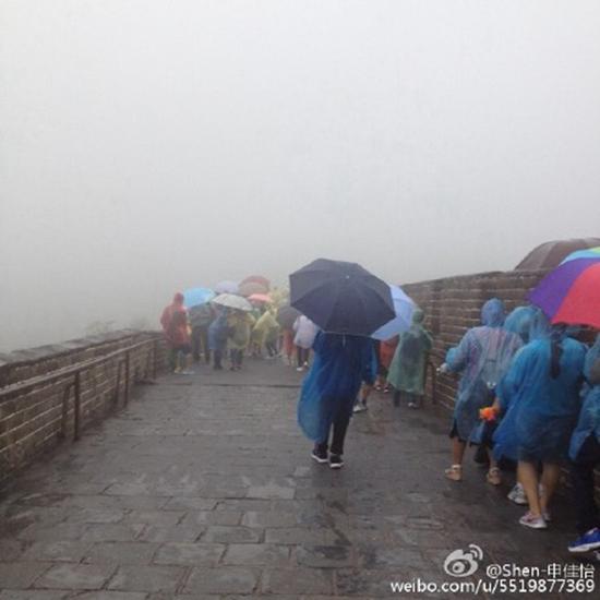今晨,長(zhǎng)城降雨,路面濕滑,游客打傘行走。來(lái)源@微博網(wǎng)友