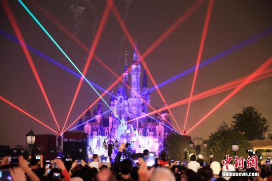 資料圖:6月16日晚,美輪美奐的燈光煙花秀讓上海迪士尼城堡變得幻彩無比,成當日上海迪士尼開園最華美絢麗的表演之一,吸引數(shù)萬游客觀賞。中新社記者 潘索菲 攝