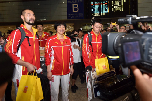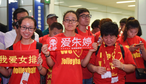 央視網(wǎng)消息:23日晚約十點,載譽歸來的中國女排抵達北京首都國際機場,現(xiàn)場接機球迷在見到女排隊伍后陷入沸騰。原定北京時間晚上七點四十落地的中國女排,因飛機晚點約兩個小時,在晚上十點左右才抵達機場。此后,經(jīng)過約一個小時的等待,現(xiàn)場球迷和媒體終于見到了女排姑娘們的面容。當主教練郎平及其弟子朱婷、惠若琪等人出現(xiàn)在機場到達通道時,粉絲們大聲喊起口號、高舉橫幅、海報、鮮花,歡迎女排勝利歸來。