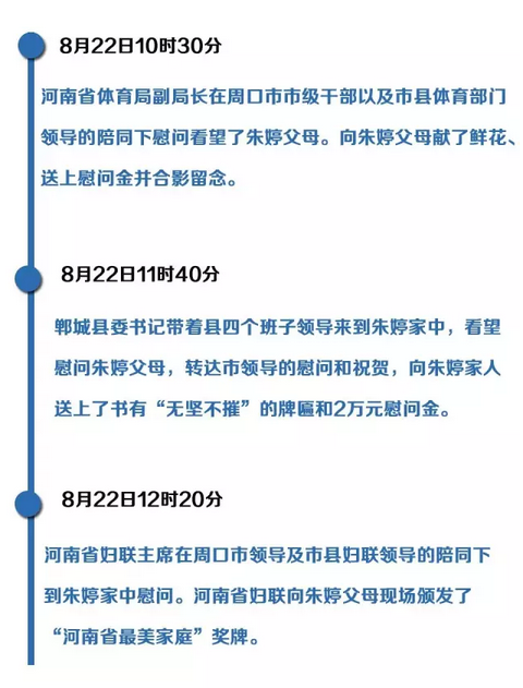 文章表示,8月22日,省市縣各級(jí)領(lǐng)導(dǎo)紛紛來到女排主攻手朱婷的老家,慰問英雄父母朱安亮和楊雪蘭,授予朱婷“河南省三八紅旗手”榮譽(yù)稱號(hào),同時(shí)授予朱婷家庭“河南省最美家庭”榮譽(yù)稱號(hào)。鄲城縣委、縣政府贈(zèng)送了“無堅(jiān)不摧”牌匾和2萬元慰問金。
