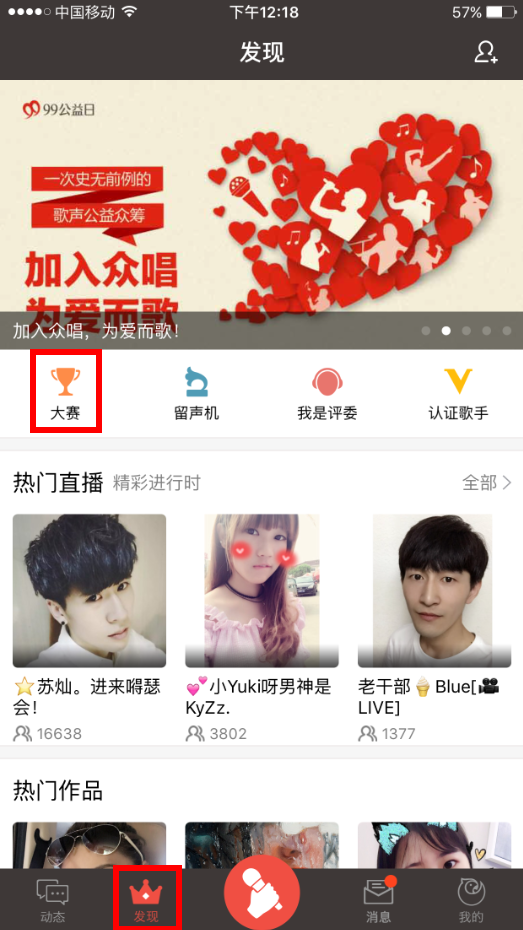 打開“全民K歌”APP,點擊左下角的“發(fā)現(xiàn)-大賽”,或者通過活動圖片進入活動頁面中。點擊“立即參賽”,選擇我們提供的任意一段教學(xué)視頻,學(xué)習(xí)后錄制并上傳屬于自己的演唱視頻。