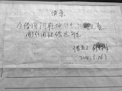 臧林峰給閆乾坤寫(xiě)的“借條”顯示:“今借用閆乾坤貸款捌萬(wàn)元整,用于信用社償還利息”,落款日期為2014年3月26日。