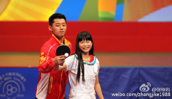 親手執(zhí)拍回?fù)、手把手教學(xué)指導(dǎo),在伊利沙伯體育館進行的乒乓球示范表演上,本來是李曉霞和一個香港小女孩打球,張繼科突然出現(xiàn)親身指導(dǎo)小女孩,手把手的教她打球的情景,引起現(xiàn)場觀眾的連聲尖叫。