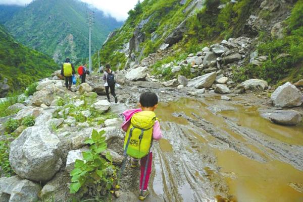 由于下雨,石頭有些濕滑,潘土豐抱著雯雯,緩緩前行,每一步,得先用腳試著踩一下,確定踩實了,再下腳。除了石頭路,還有泥巴路。“這段路,我們走了一個多星期才走完!彪m然沿途驚險重重,好在,一家人平安到達終點。