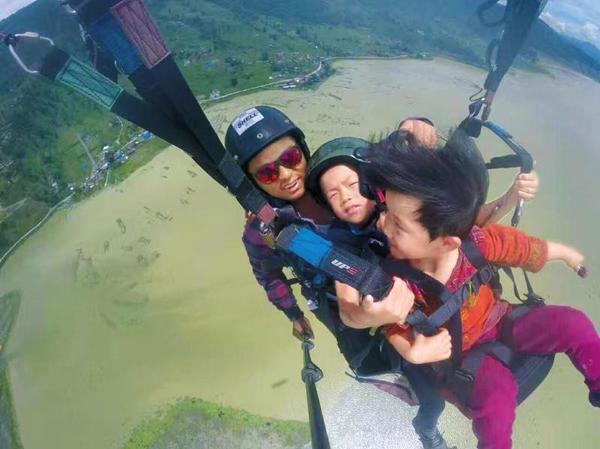 帶著雯雯坐滑翔傘的教練,是個尼泊爾人,對于這個4歲的小女孩,他贊不絕口!癝he is a super kid,it’s my lucky day that I could fly with her today。(她很厲害,我很幸運今天可以跟她一起飛。)”