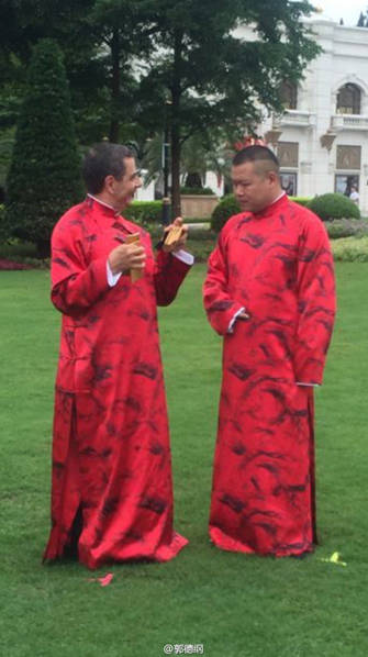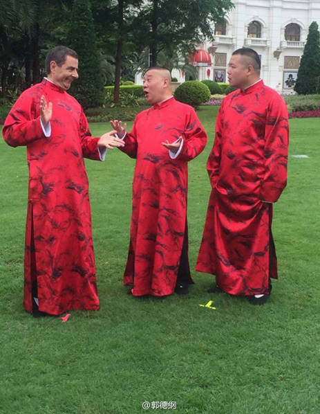 9月7日,郭德綱微博曬出與“憨豆先生”扮演者羅溫·艾金森(Rowan Atkinson)一同工作的花絮照,并寫道:“讓他穿大褂容易,教他唱快板有點(diǎn)難…… ”畫面中,他與“憨豆先生”穿大紅褂唱快板,畫面搞笑有趣,似乎未受“曹云金長文開罵”事件影響。