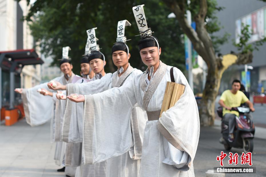 9月8日,一群身著中國春秋戰(zhàn)國時期服飾的年輕人出現(xiàn)在南京街頭,一邊誦讀詩詞,一邊向市民派送免費月餅。據(jù)悉,他們來自常州淹城,在中秋佳節(jié)來臨之際,希望通過這種形式,喚起民眾對于傳統(tǒng)節(jié)日的美好回憶。寒單 攝