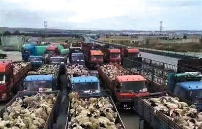 數(shù)十輛卡車載著羊群前往放生目的地色達(dá)草原。