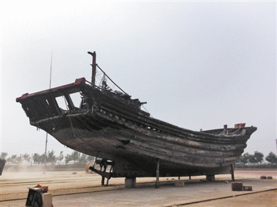 自去年10月出事后,02271一直停放在河北樂亭縣中心漁港的船廠塢道上。這是一艘24米長的木船,船底由水泥墩和長木支撐,船身懸空。船尾右側(cè)有兩個方形的窟窿,船底的螺旋槳鐵片都已折斷。
