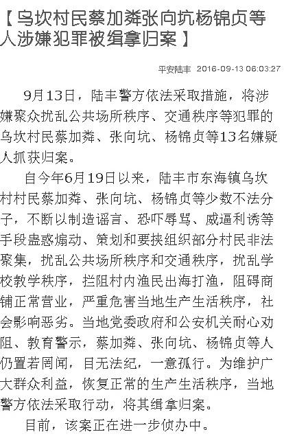 9月13日,陸豐警方依法采取措施,將涉嫌聚眾擾亂公共場(chǎng)所秩序、交通秩序等犯罪的烏坎村民蔡加粦、張向坑、楊錦貞等13名嫌疑人抓獲歸案。
