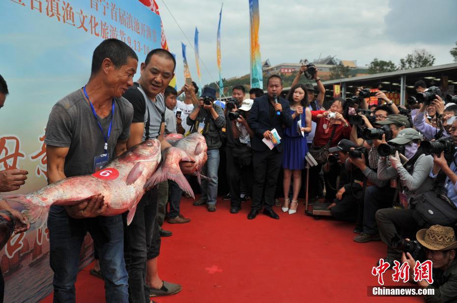 9月13日,昆明滇池迎來開湖捕魚首日,漁民帶回了多條重量在10公斤以上的大魚并進(jìn)行“魚王競(jìng)拍”,其中一條18公斤的“魚王”吸引眼球。圖為拍賣的“魚王”吸引攝影愛好者鏡頭。中新社記者 任東 攝