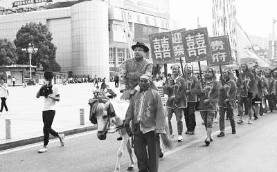 本報訊(記者商為智 實習生程佳怡 通訊員田云貴 雙V記者趙彥平)新郎身著紅袍騎在一匹白馬上,身后的迎親隊伍中分別舉著“迎親”“喜”“貴府”等字樣的牌子,新娘則坐在隊伍中的花轎內(nèi),前天,江夏區(qū)體育館附近一男子迎親隊伍引來不少路人駐足觀看。