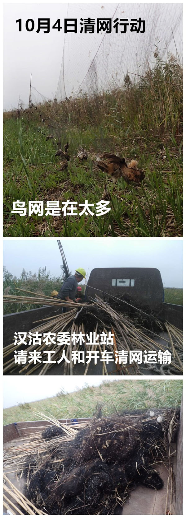 田陽(yáng)陽(yáng)稱,初步統(tǒng)計(jì),截至10月6日,志愿者總共解救活鳥(niǎo)將近2000只,掛網(wǎng)的死鳥(niǎo)3000多只,“滿地都是死鳥(niǎo),實(shí)在太多沒(méi)法統(tǒng)計(jì),現(xiàn)在蘆葦蕩還里一股腐臭味兒!
