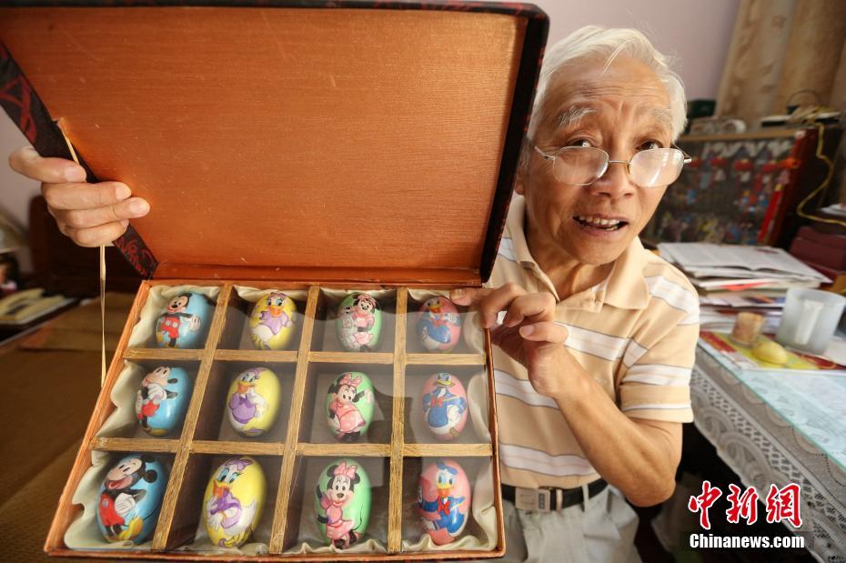 這位今年78歲的老人名叫費(fèi)永泉,已經(jīng)在蛋殼上作畫(huà)十余年。這些年來(lái),費(fèi)永泉?jiǎng)?chuàng)作的蛋殼畫(huà)超過(guò)2500幅。作為京劇迷,費(fèi)永泉的作品囊括了《西游記》、《三國(guó)演義》、《水滸傳》、《封神演義》等古典名著中的人物形象。最近,他又創(chuàng)作完成了年畫(huà)、生肖以及迪士尼系類(lèi)蛋殼畫(huà)作品。圖為8月底,老人展示他的蛋殼畫(huà)作品。 中新社記者 王亞?wèn)| 攝