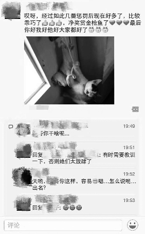 “每當(dāng)看到他發(fā)朋友圈虐貓,就感覺心酸。”趙亮(化名)為愛迪國際學(xué)校的畢業(yè)生,他告訴記者,起初學(xué)校收發(fā)室的李某收留了校園內(nèi)的兩只流浪貓,一些有愛心的同學(xué)便購買了貓窩、爬架、食盆等用品送過去?闪顚W(xué)生們沒想到是,李某開始了一系列虐待行為,“他說這叫‘受挫教育’,必須懲罰,否則貓不長記性!壁w亮氣憤地說,李某還將虐貓照片或視頻發(fā)到朋友圈,一些同學(xué)看到后很詫異,對(duì)其勸說也沒效果。