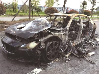揚(yáng)子晚報記者趕到現(xiàn)場看到,這輛瑪莎拉蒂已被燒成一具空殼,從車頭到車尾漆黑一團(tuán),沒有一處完整的地方。所有玻璃均被燒壞,蕩然無存;后備箱連帶蓋板被燒空,轎廂里燒得只剩鐵椅架;四只輪胎均被燒毀,前引擎蓋高高翹起,還被燒破了一個洞。透過縫隙,發(fā)動機(jī)部位凌亂不堪,各種部件及線路雜亂無章。記者只能從前面車頭處留存的一個大的車標(biāo)判斷,它是一輛瑪莎拉蒂。而從前保險杠處殘留的漆面來判斷,它是一輛黑色的豪車。