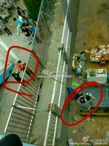 駐馬店泌陽(yáng)縣二高被曝建雙圍墻,學(xué)生和校外商販通過“長(zhǎng)桿”隔雙墻交易。 圖片來(lái)源@駐馬店生活