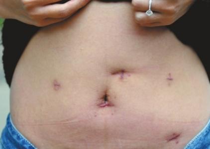 至此,鄭女士一共經(jīng)歷了三次手術(shù)。掀開上衣,鄭女士指著肚上多處縫合傷口說(shuō):“本來(lái)只有3個(gè)小孔,現(xiàn)在變成了6個(gè)洞,而且有3處打開、縫合了3次!