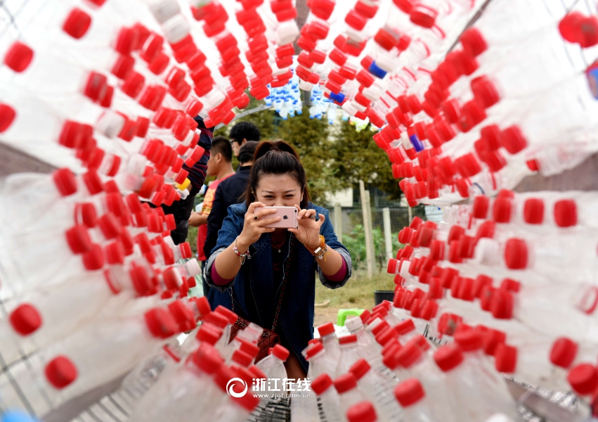 10月12日,在杭州余杭區(qū)黃湖自然體驗園,環(huán)保志愿者們正在用撿來的近1萬只飲料瓶,搭建1個直徑2.5米,長約9米的“漂流瓶”。