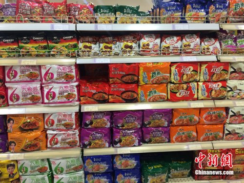 北京一家超市貨架上擺放的方便面。中新網(wǎng)邱宇 攝