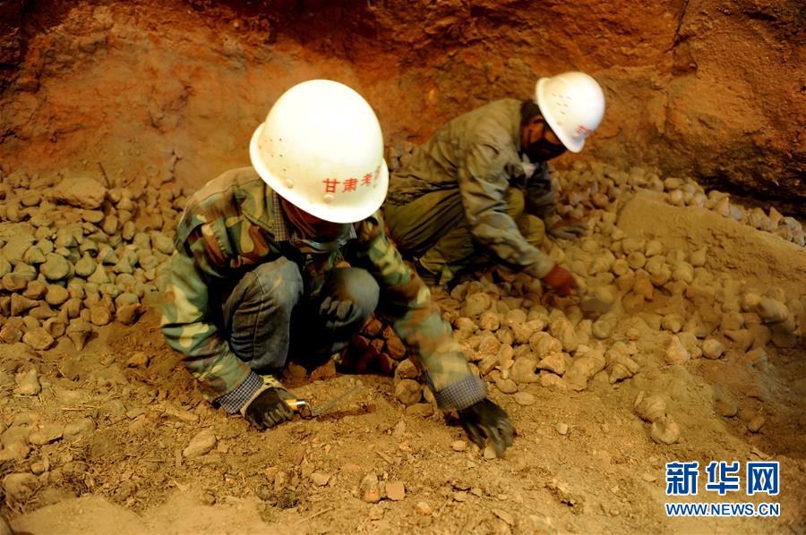 今年初開始的甘肅武威亥母寺洞窟遺址考古發(fā)掘工作近日取得重大進(jìn)展,出土了4萬(wàn)余個(gè)擦擦和大量經(jīng)文殘片,并且出土了一幅唐卡。圖為考古人員在亥母寺洞窟遺址內(nèi)進(jìn)行發(fā)掘(10月15日攝)。新華社記者連振祥攝