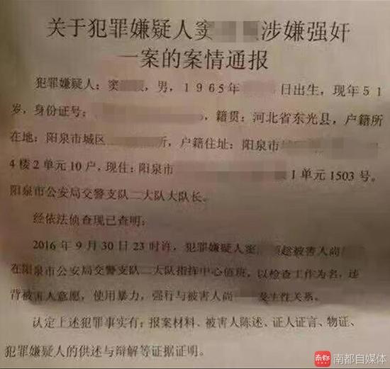 網(wǎng)傳通報顯示,竇某某,男,1965年生,現(xiàn)任陽泉市公安局交警支隊二大隊大隊長,經(jīng)依法偵查查明:2016年9月30日23時許,竇某某趁尚某某在二大隊指揮中心值班,以檢查工作為名,違背尚某某意愿,使用暴力,強行與其發(fā)生性關(guān)系。認(rèn)定上述犯罪事實有報案材料、被害人陳述、證人證言、物證、竇某某的供述與辯解等證據(jù)證明。