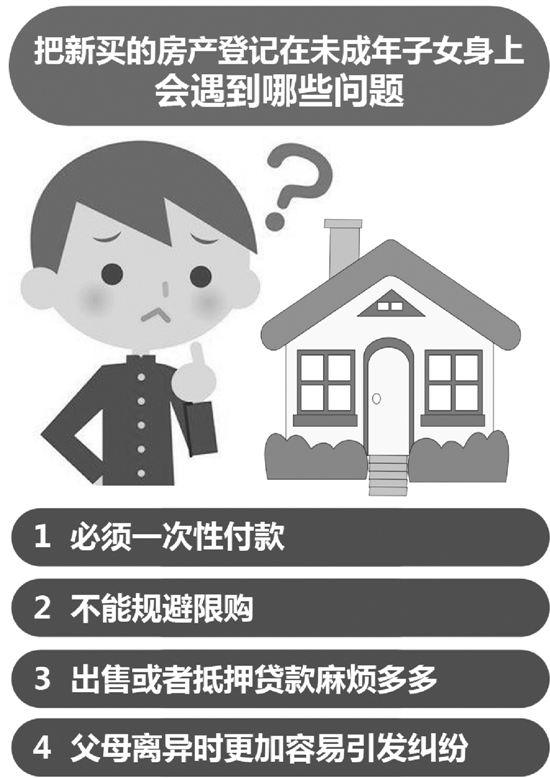 興許是出于前段時(shí)間房?jī)r(jià)有所上升,各地又紛紛出臺(tái)限購(gòu)令,如果把新買的房產(chǎn)登記在未成年子女身上是不是好處多多呢?最近這個(gè)話題在微信朋友圈里迅速發(fā)酵,有的微信公眾號(hào)還支招——這類“娃娃房”如果遇見(jiàn)風(fēng)險(xiǎn)如何規(guī)避。
