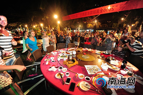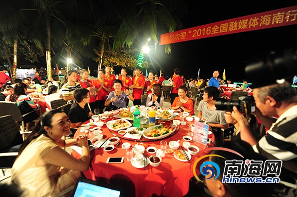 參加“全域旅游 海南范例——2016全國融媒體海南行”大型采訪活動的52家全國融媒體記者在三亞東海龍宮餐廳欣賞椰風(fēng)海韻,品嘗地道海南美食。南海網(wǎng)記者 沙曉峰 攝