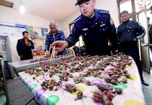 昨天,市園林局森林公安局與執(zhí)法監(jiān)察大隊(duì)聯(lián)手, 分14路突擊通州、大興的鳥市、果園和餐館,查處捕獵和售賣野鳥的違法行為。