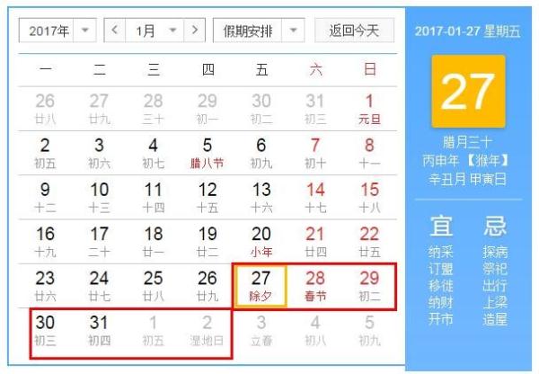 2017年1月27日至2017年2月2日調(diào)休,