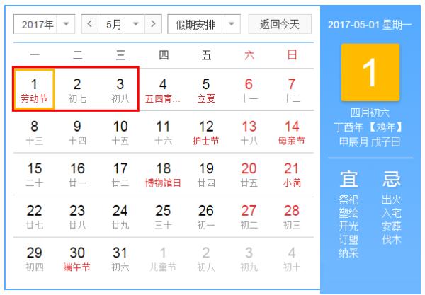 2017年5月1日至5月3日放假調(diào)休,