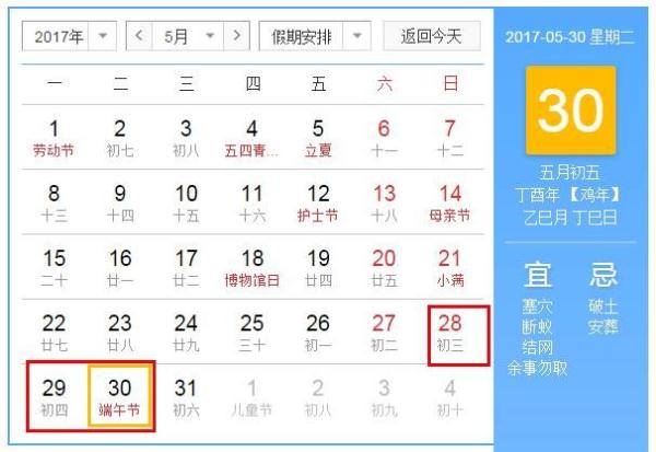 2017年5月28日至5月30日放假調(diào)休,