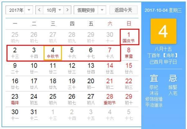 2017年中秋在2017年10月4日(星期三),