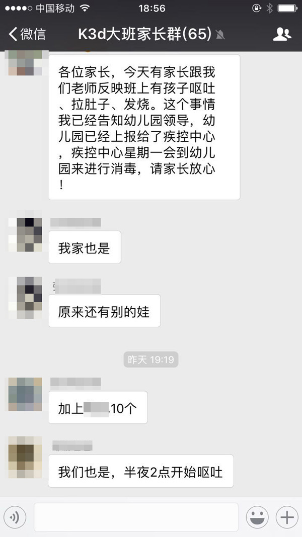 據(jù)該班家長介紹,大四班有27名孩子,周四(4日)當天有少數(shù)幾個孩子請假、沒去上課,其余有20個孩子,從周五凌晨開始,陸續(xù)出現(xiàn)嘔吐、頭暈、肚子疼等癥狀。