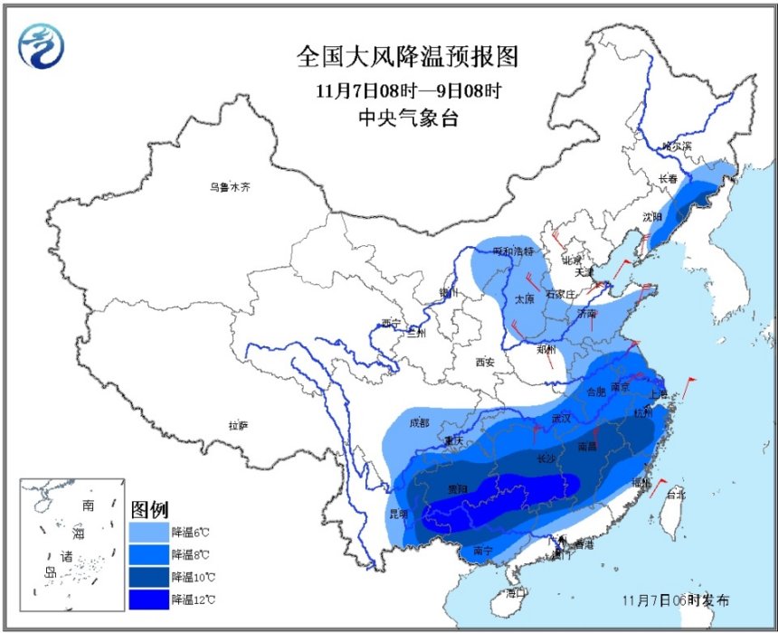受強(qiáng)冷空氣影響,7日至9日,我國中東部地區(qū)將出現(xiàn)明顯的大風(fēng)降溫天氣。南方大部地區(qū)氣溫將下降8~10℃,其中,江南中南部、華南北部、貴州、云南東部等地的部分地區(qū)降溫幅度可達(dá)10~12℃,局地12℃以上;東北地區(qū)東南部、華北西部和南部、黃淮東部等地的部分地區(qū)氣溫將下降6~8℃,局地降溫幅度可達(dá)10℃以上。上述大部地區(qū)將有4~6級(jí)風(fēng),陣風(fēng)7級(jí)。我國東部和南部海區(qū)先后將有7~8級(jí)、陣風(fēng)9~10級(jí)偏北風(fēng)。