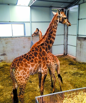 為了防止長頸鹿寶寶因公路喇叭等噪音而出現(xiàn)驚嚇,在出發(fā)前幾天,工作人員就不時在長頸鹿居住的地方開拖拉機、按喇叭,讓長頸鹿慢慢適應(yīng)。長頸鹿敏感、膽小,運輸前,飼養(yǎng)員會將運輸籠放到獸舍門口,里面放飼料,長頸鹿就會逐漸習慣運輸籠的存在。