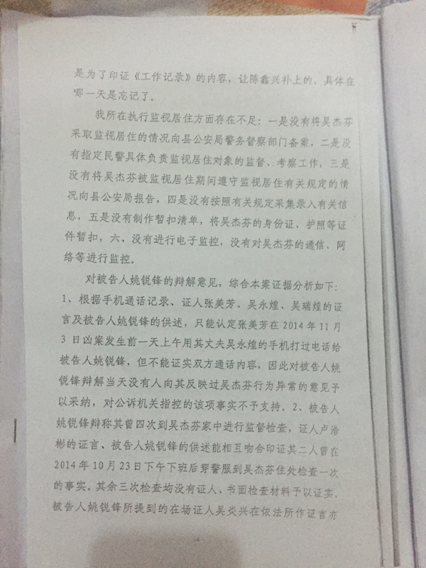 對(duì)于判決書提及的“瀆職行為”,如沒有指定民警具體負(fù)責(zé)吳杰芬監(jiān)視居住的監(jiān)管、考察工作;案發(fā)后曾偽造《監(jiān)視居住監(jiān)管工作記錄》,姚銳鋒也承認(rèn),作為轄區(qū)派出所所長(zhǎng),他的工作確實(shí)有所疏忽。