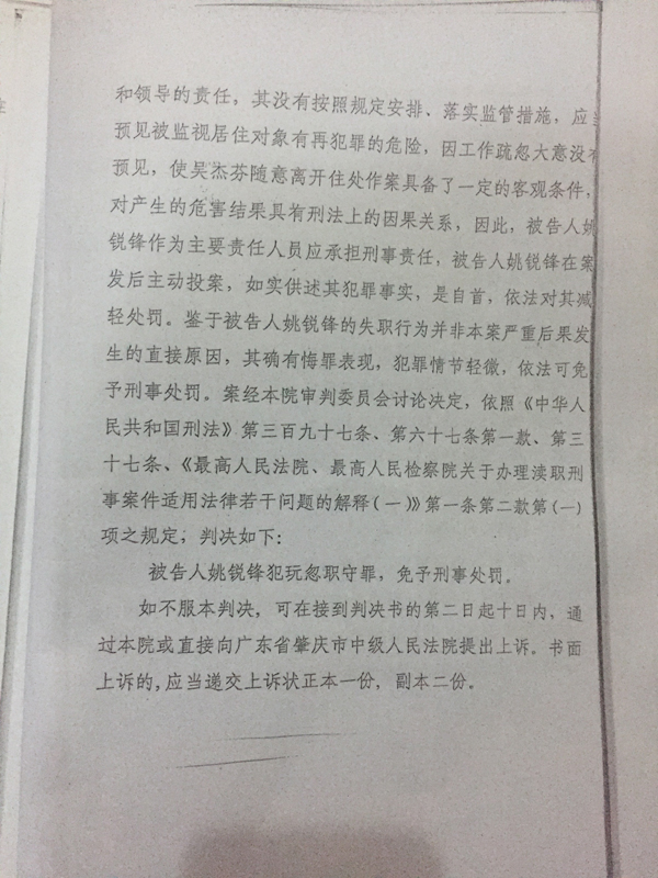 2015年11月,肇慶市中級(jí)人民法院二審判決,在案證據(jù)足以證實(shí)長(zhǎng)崗派出所在對(duì)吳杰芬監(jiān)視居住的執(zhí)行過程中,確實(shí)存在監(jiān)管、執(zhí)行不到位的情形,并導(dǎo)致了嚴(yán)重結(jié)果的發(fā)生,姚銳鋒作為派出所所長(zhǎng)未認(rèn)真履行職責(zé),其行為已構(gòu)成玩忽職守罪。姚銳鋒犯玩忽職守罪,判處有期徒刑一年,緩刑二年。