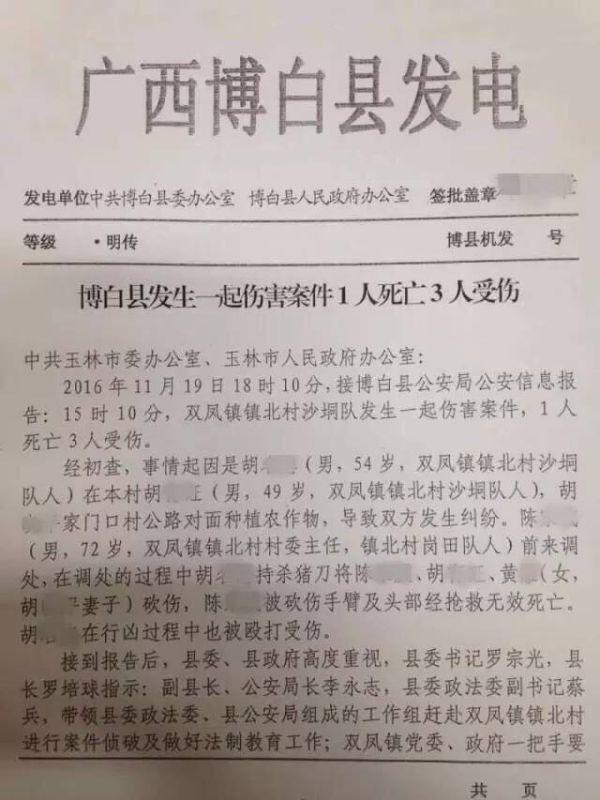 11月19日下午,廣西省玉林市博白縣發(fā)生一起持刀傷人事件。知情人士提供的博白縣政府的通報(bào)材料顯示,雙鳳鎮(zhèn)鎮(zhèn)北村沙垌隊(duì)的傷害案件發(fā)生在19日15時(shí)10分,致1人死亡3人受傷。