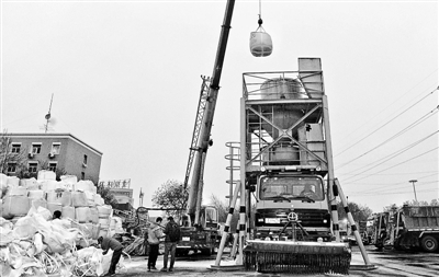 昨天下午5點半,北京青年報記者來到馬家樓橋附近的北京環(huán)衛(wèi)集團北京城市機掃公司,數(shù)十輛多功能除雪車正排隊灌裝融雪劑,做好上路除雪前的最后準(zhǔn)備。這些車輛將根據(jù)最新氣象預(yù)報結(jié)果,在降雪來臨前的一小時左右到達(dá)指定清掃路段,應(yīng)對今冬首場大雪。另外,北京環(huán)衛(wèi)集團昨晚約有360輛除雪車輛設(shè)備、730名環(huán)衛(wèi)人員備勤。