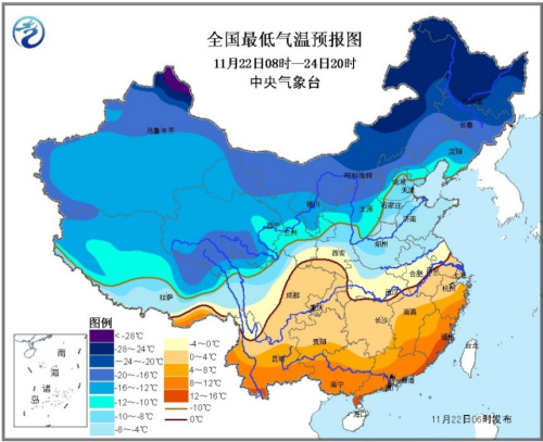 24日凌晨,華北平原北部最低氣溫將達(dá)到-10℃左右,最低溫度0℃線將位于江南北部,江南南部和華南北部最低氣溫將達(dá)到4~8℃。