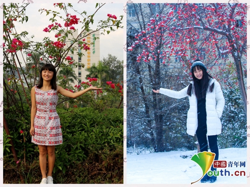 “我的南方的校園里四季如春,綠意盎然!薄拔以诒狈降男@中大雪紛飛,滿樹(shù)銀花。”中國(guó)青年網(wǎng)通訊員 賴麗萍 楊坤 攝 中國(guó)青年網(wǎng)北京11月21日電(記者 崔寧寧 通訊員 賴麗萍劉倩)“南國(guó)春意濃,北國(guó)正冰封”。