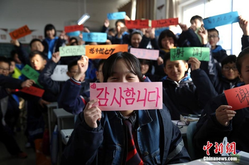 資料圖:鄭州中學(xué)生“感恩節(jié)”多國語言表謝意。周小云 攝